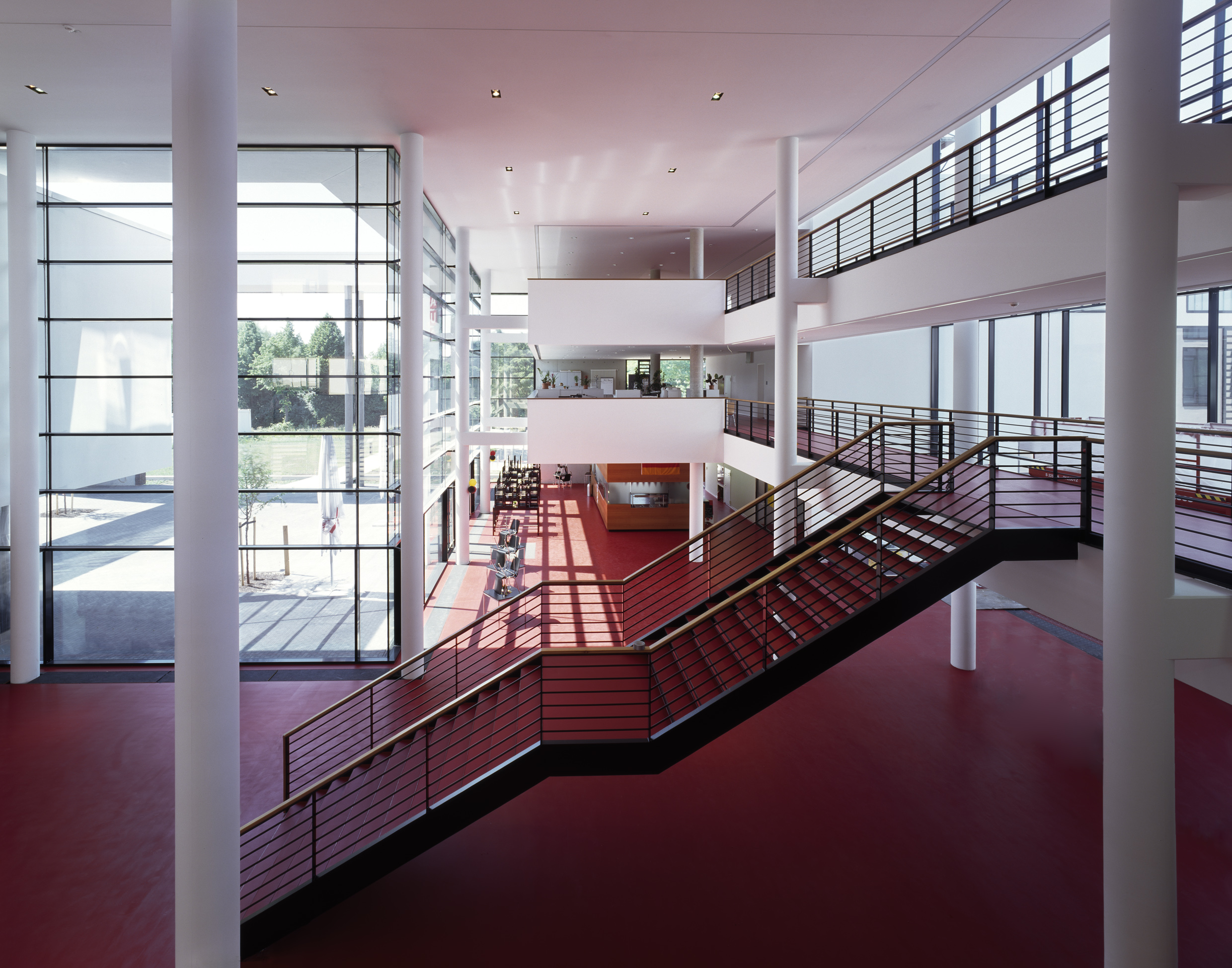Der Eingangsportikus bindet das Kompetenzzentrum an das Chaos der umgebenden Strassen- und Brachlandschaft an. Eine Schnittstelle, ein Ort des Innehaltens… von hier aus erschließt sich dem Besucher in Ruhe die Vielfalt der mehrgeschossigen Stadtanlage des Neubaus.
